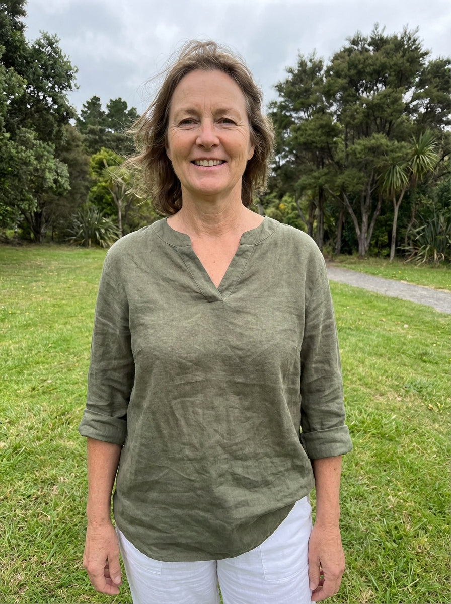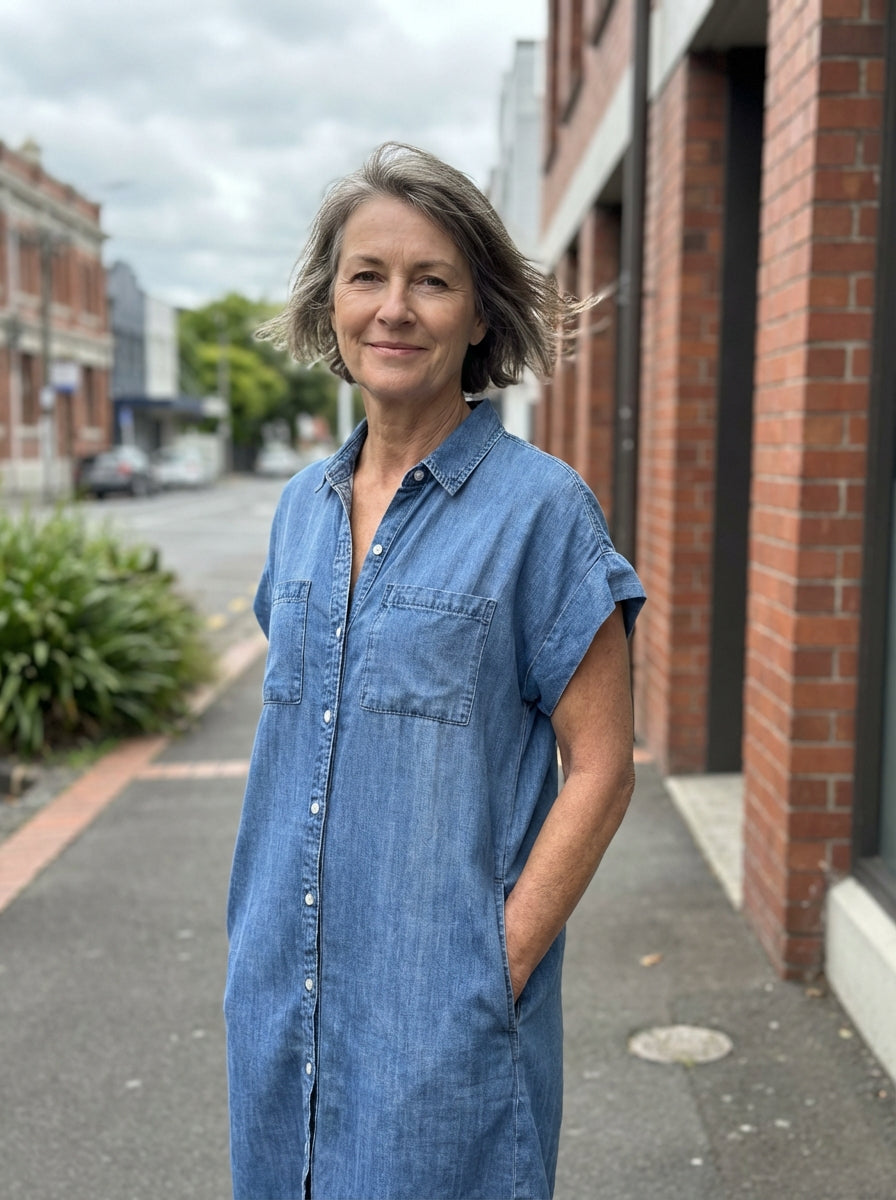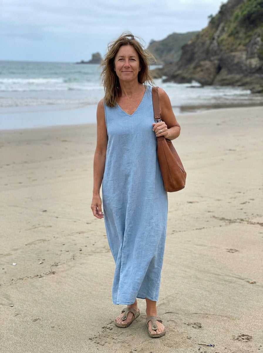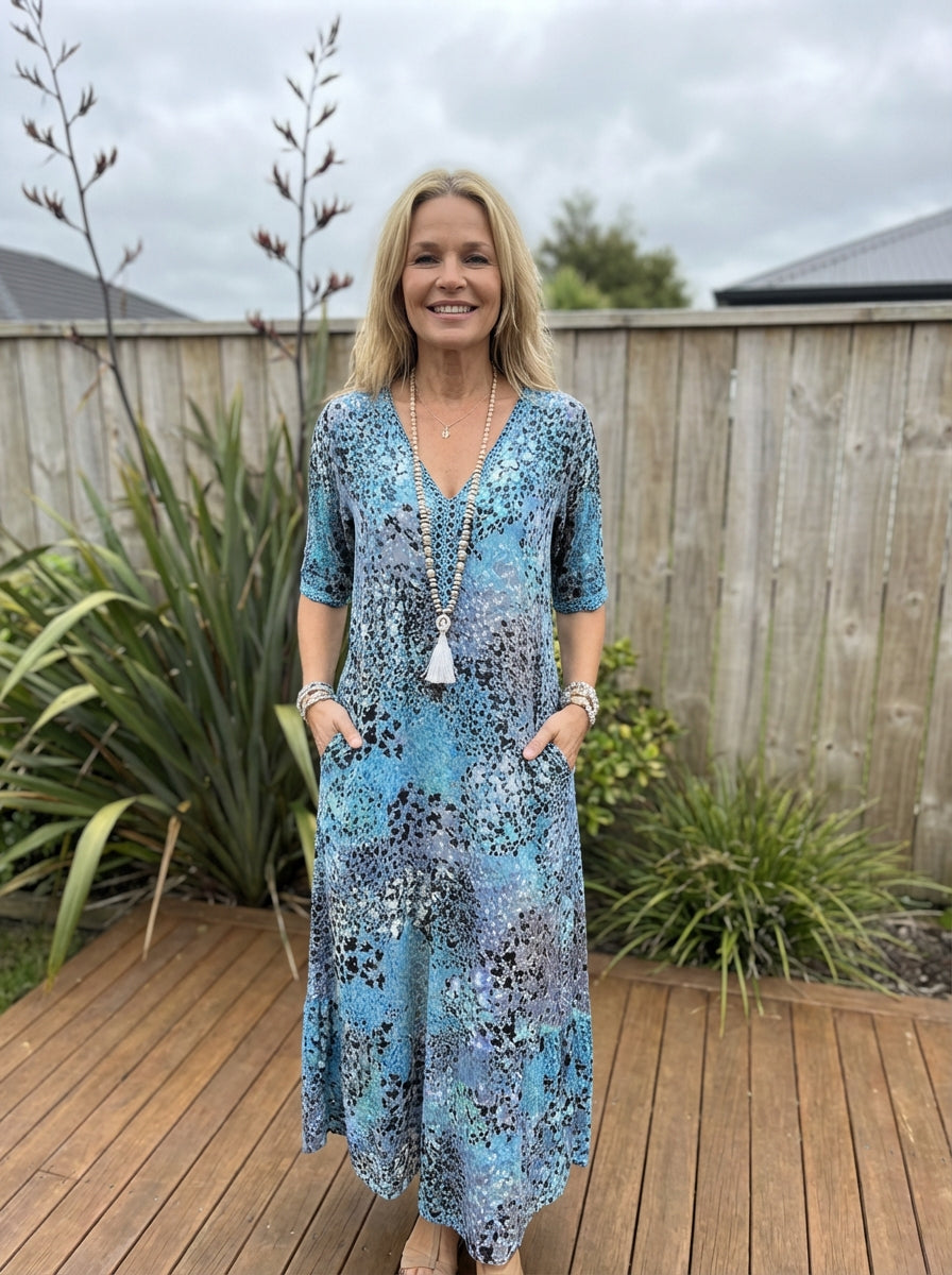 This dress invites you to take a deep breath and let the day unfold peacefully. The soft print and loose silhouette caress the body, while the V-neck and subtle details evoke a natural, carefree femininity.