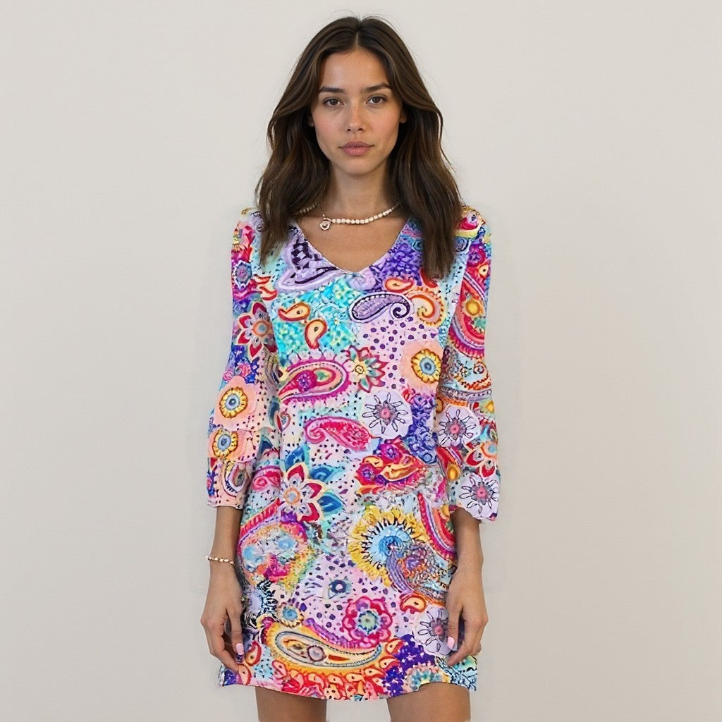 El vestido Solea llama la atención por su estampado alegre y sus detalles femeninos.